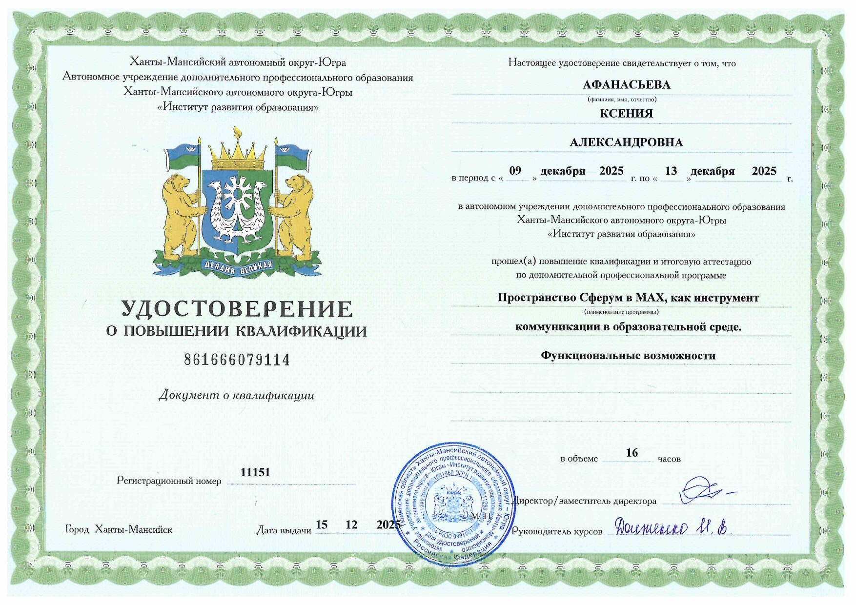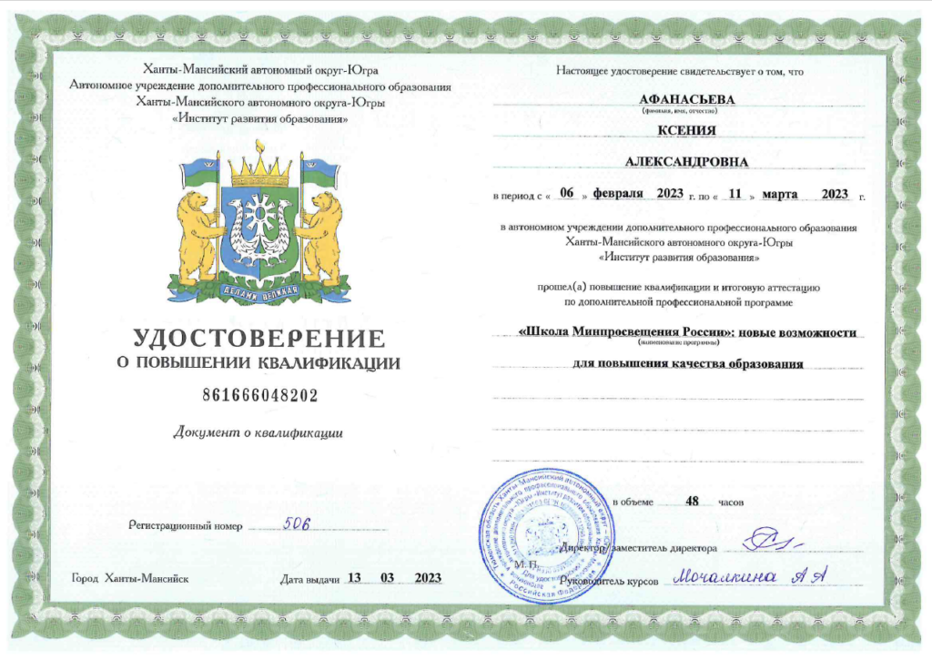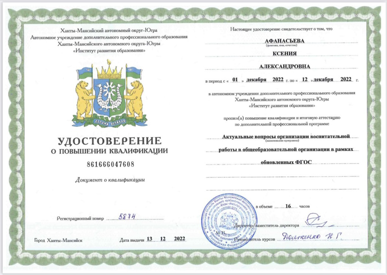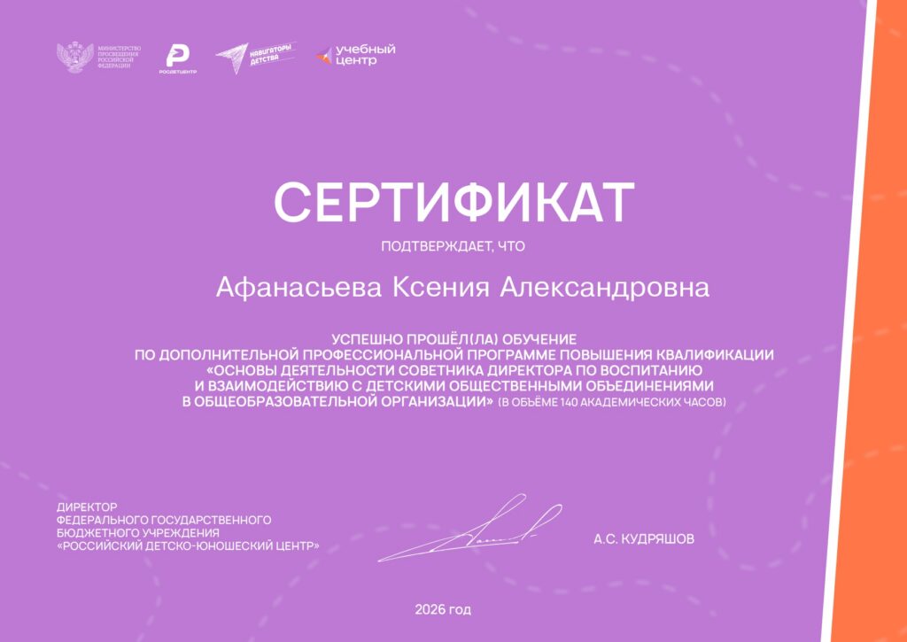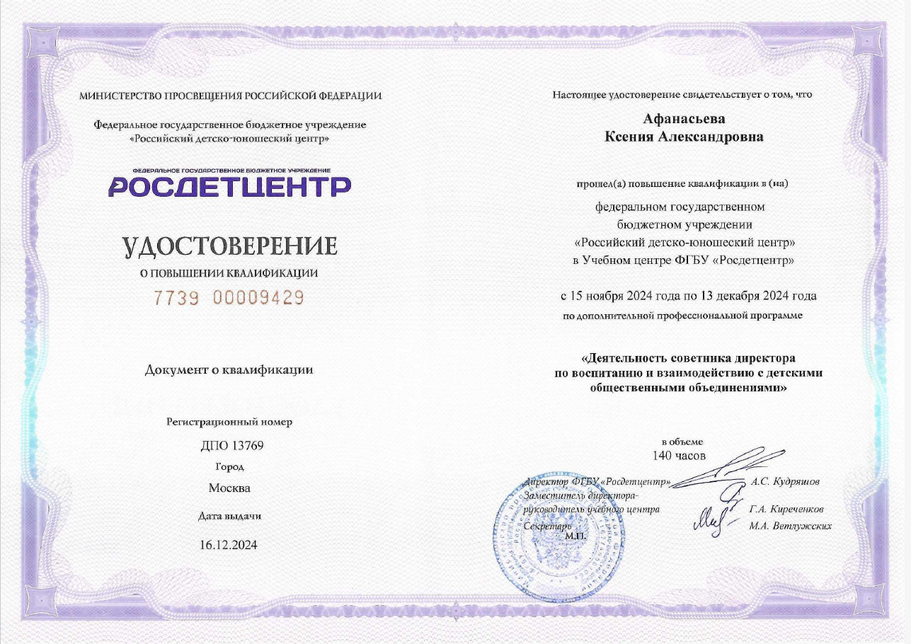 Удостоверение: «Основы деятельности советника директора по воспитанию и взаимодействию с детскими общественными объединениями в общеобразовательной организации»